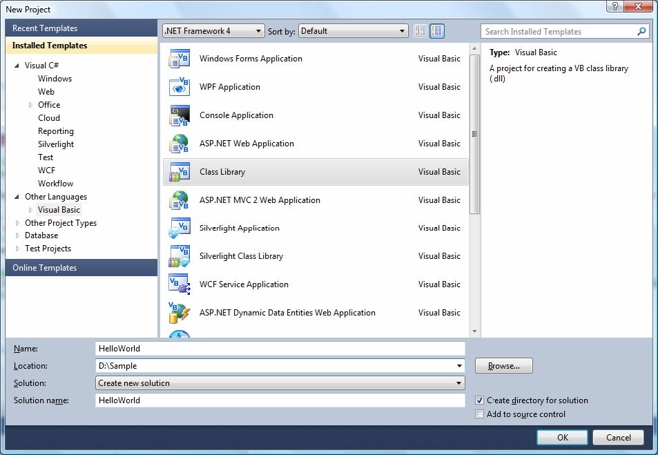 3. In the right-hand frame, click Class Library. The application assumes that your project location is: D:\Sample.
