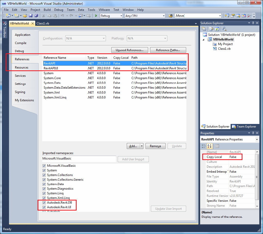 9. To complete the process, click RevitAPI in the Reference frame to highlight it. Set Copy Local to False in the property frame. Repeat for the RevitAPIUI.dll.