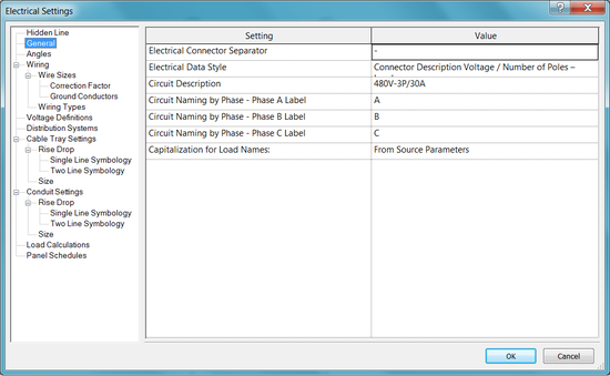 The ElectricalSetting class provides access to different electrical settings, such as fitting angles, wire types, and voltage types. There is one ElectricalSetting object per document and it is accessible through the static method ElectricalSetting.GetElectricalSettings().
