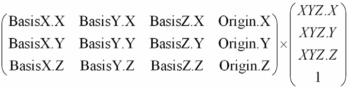 Transforms are limited to 3x4 transformations (Matrix) in the Revit application, transforming an object's place in the model space relative to the rest of the model space and other objects. The transforms are built from the position and orientation in the model space. Three direction Vectors (BasisX, BasisY and BasisZ properties) and Origin point provide all of the transform information. The matrix formed by the four values is as follows: