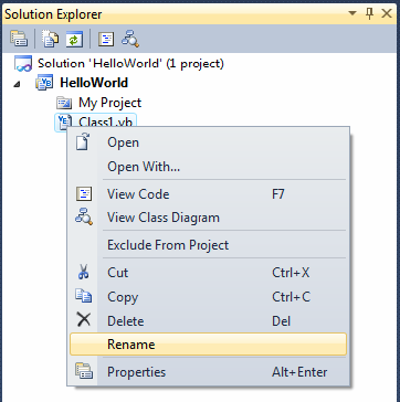 - From the context menu, select Rename. Rename the file HelloWorld.vb.
