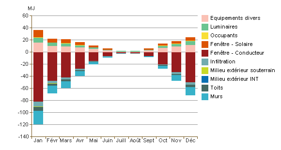 Exemple : dans l'exemple de graphique ci-dessus, la plus grande valeur négative pour janvier est Conduction des fenêtres. Par conséquent, la perte de chaleur due à la conduction à travers les fenêtres représente la demande de chaleur mensuelle la plus grande pour janvier. Toutefois, les équipements divers (qui incluent les connecteurs d'alimentation, les ordinateurs, les équipements de bureau, etc.) réduisent la demande de chaleur.