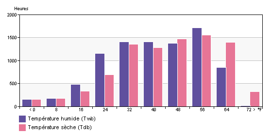 Lors de la consultation d'une analyse d'énergie dans la boîte de dialogue Résultats et comparaison, ce graphique affiche le nombre d'heures (par an) pendant lesquelles les températures sèches et humides sont comprises dans une plage donnée.