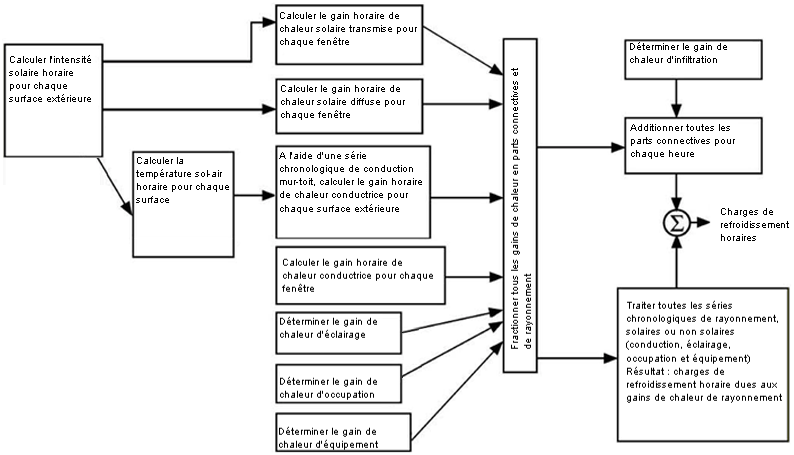 La plupart des sources de chaleur transfèrent l'énergie dans une pièce par une combinaison de convection et de rayonnement. La partie convective du gain de chaleur devient immédiatement une charge de refroidissement. La partie radiative doit d'abord être absorbée par les finitions et le volume des surfaces des pièces intérieures, puis devient une charge de refroidissement uniquement lorsqu'elle est transférée par convection de ces surfaces à l'air de la pièce. Par conséquent, les gains de chaleur par rayonnement deviennent des charges de refroidissement après une certaine période de temps.