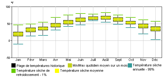 Min/Max quotidien moyen sur un mois | Températures sèches quotidiennes minimales et maximales moyennes pour chaque mois. |