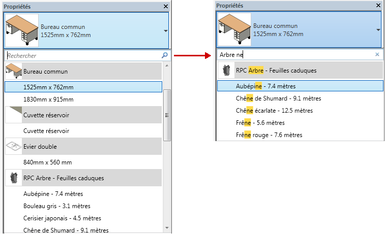 Une fonction de recherche est disponible dans Revit pour faciliter la sélection à partir d'une longue liste d'options. Vous pouvez effectuer une recherche dans les zones fonctionnelles suivantes :