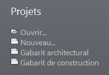La fenêtre Fichiers récents peut répertorier jusqu'à cinq gabarits sous Projets. Un gabarit de projet fournit un point de départ pour créer un nouveau projet, définir les paramètres, les styles et les informations de base. Les gabarits peuvent simplifier la configuration du projet, uniformiser la documentation du projet et garantir le respect des normes professionnelles.