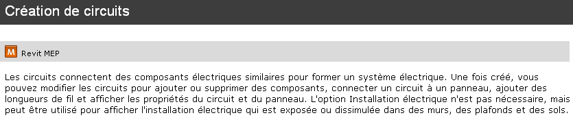 Dans cet exemple, la légende indique que la totalité de la rubrique s'applique à Revit MEP et aux fonctions d'Autodesk Revit relatives à MEP.