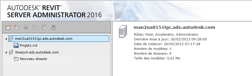 Utilisez Revit Server Administrator pour gérer les dossiers et les modèles centraux sur les serveurs Revit Server Host et pour verrouiller des modèles afin d'effectuer des tâches d'administration.