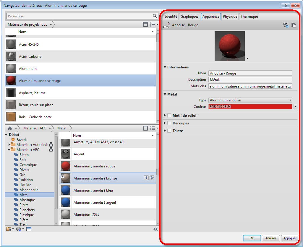 Dans le navigateur de matériaux, les informations s'affichent dans les onglets Identité, Graphismes et Apparence de l'Editeur de matériaux.