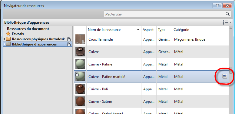Remplacez une ressource par une autre ressource que vous sélectionnez dans le navigateur de ressources. Le matériau adopte les propriétés de la nouvelle ressource.
