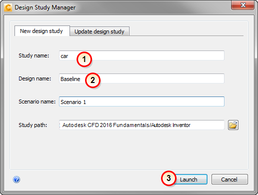 3. In the Design Study Manager, assign names to the design study, design, and scenario