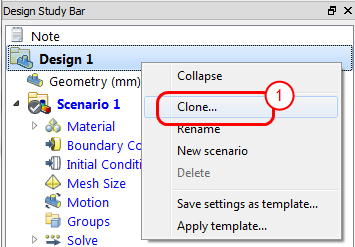 - In Autodesk® CFD, on the Design Study bar, right click on a Design, and click Clone. Assign a unique name to the new Design. Note that all scenarios of the Design are also cloned.