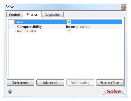 The default settings define an incompressible, turbulent flow analysis, with no heat transfer. The parameters are all engineering in nature, and are listed below:
