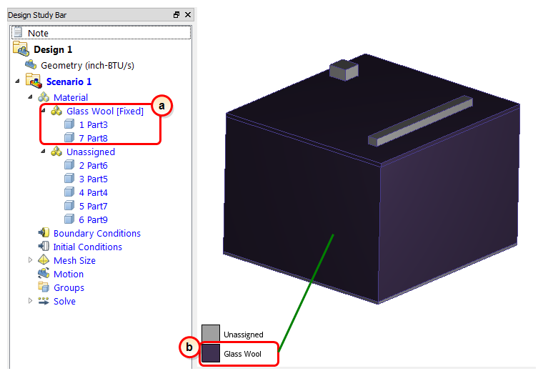 a. On the Design Study bar, confirm the material assignment for the Glass Wool parts.