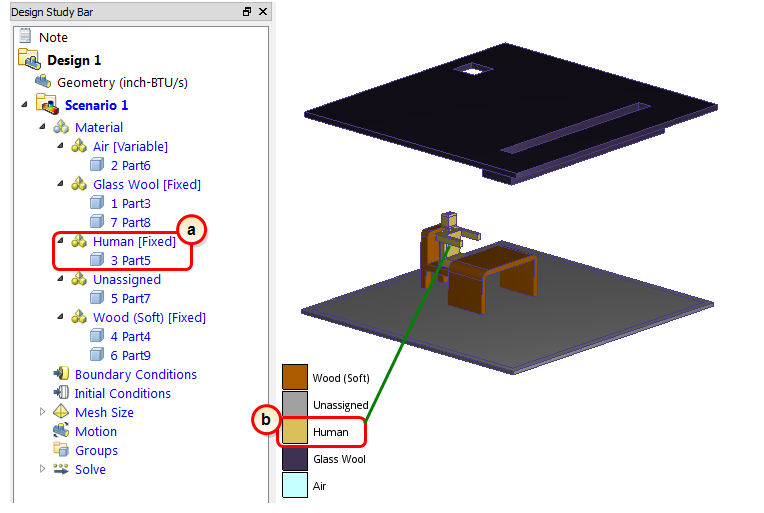 5. To verify that the Human material is properly assigned, check the Design Study Bar and the part coloring: