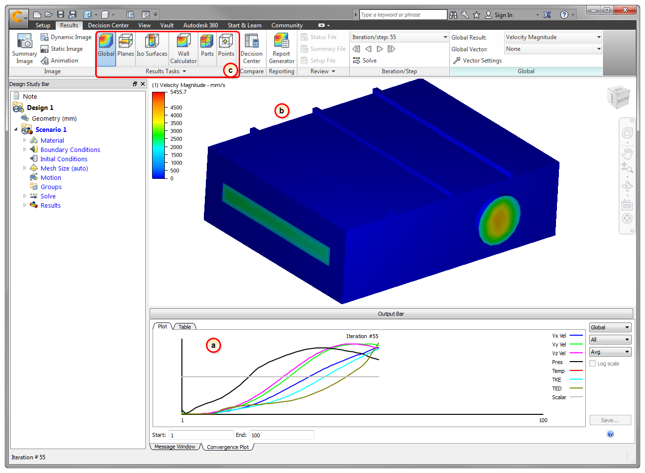Note: For the first 100 iterations, the Temperature results do not change. Auto Forced Convection runs 100 flow-only iterations before solving for heat transfer. We can do this because the air moves fast enough to eliminate buoyancy effects. If buoyancy was relevant, we would solve flow and heat transfer together.