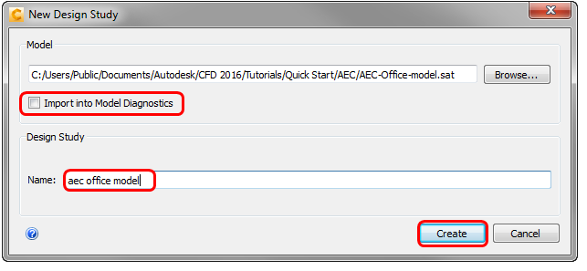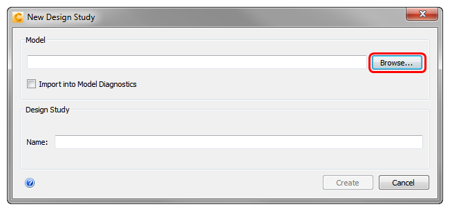 4. On the New Design Study dialog, enter a name for the Name, make sure Import into Model Diagnostics is unchecked, and click Create: