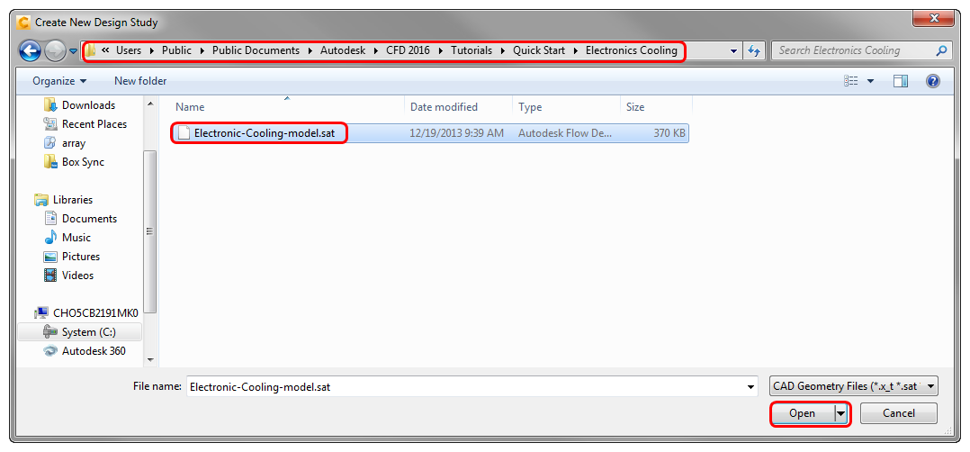 3. Navigate to C:\Users\Public\Public Documents\Autodesk\CFD 2016\Tutorials\Quick Start\Electronics Cooling, and select Electronic-Cooling-model.sat. Click Open.