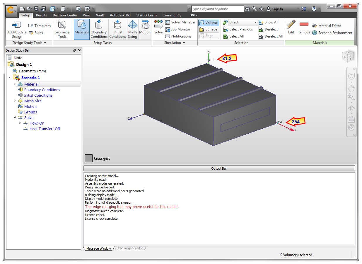Autodesk® CFD starts, and you should see the model. Note the dimension values on the axes: