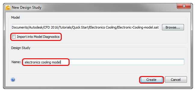 4. On the New Design Study dialog, enter the design study Name, make sure Import into Model Diagnostics is unchecked, and click Create: