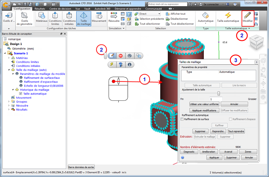 Servez-vous des outils de maillage pour personnaliser la distribution du maillage. Tous ces outils sont accessibles dans la boîte de dialogue d'édition rapide Tailles de maillage. Pour simplifier le processus de travail, de nombreux outils sont également disponibles dans la barre d'outils et le groupe de fonctions contextuel.