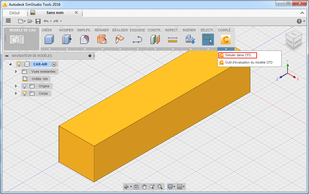 Développez le menu Compléments, puis sélectionnez Simuler dans CFD.