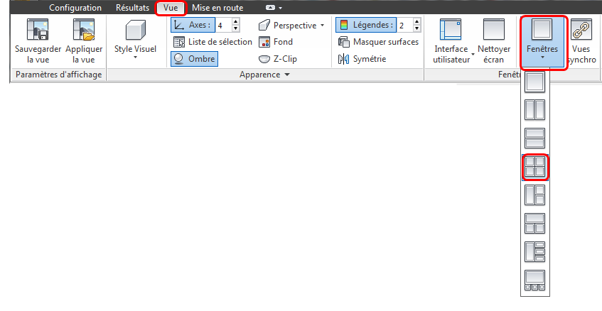 Pour montrer les quatre fenêtre d'affichage, cliquez sur Fenêtres d’affichage dans l'onglet Affichage et sélectionnez la valeur quatre :