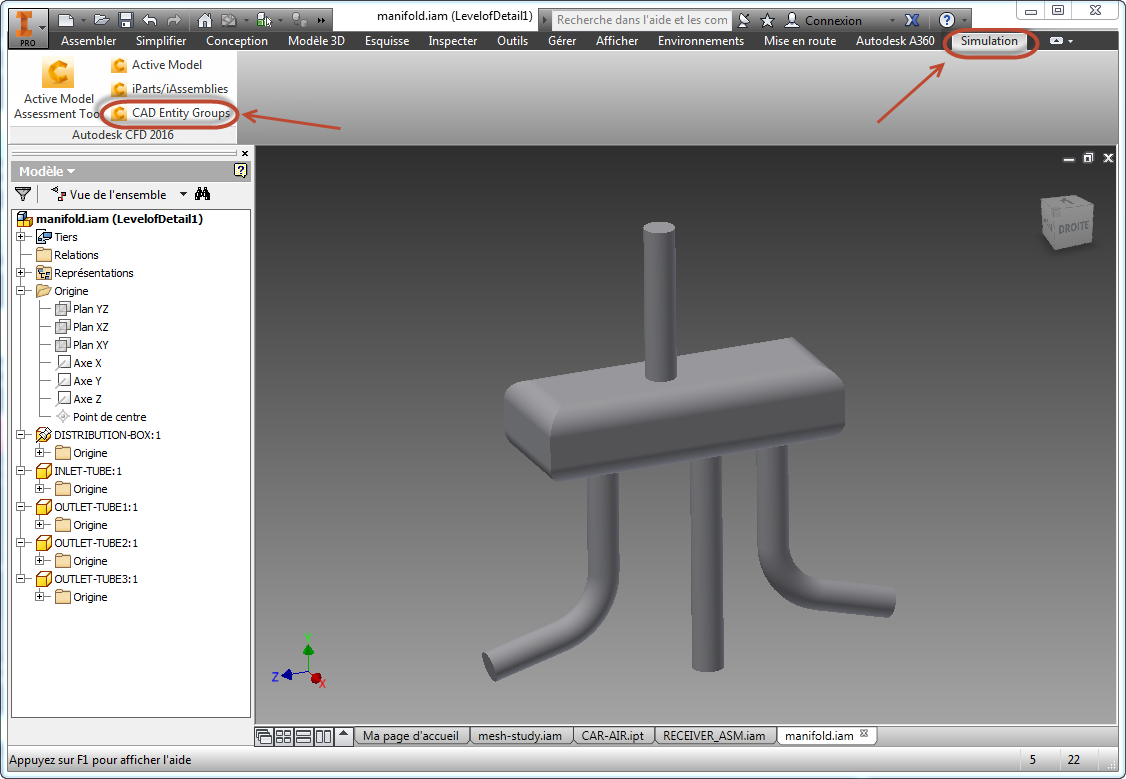 Par exemple, si vous effectuez le lancement dans Autodesk® Inventor, cliquez sur Simulation et sur Groupes d'entités de CAO: