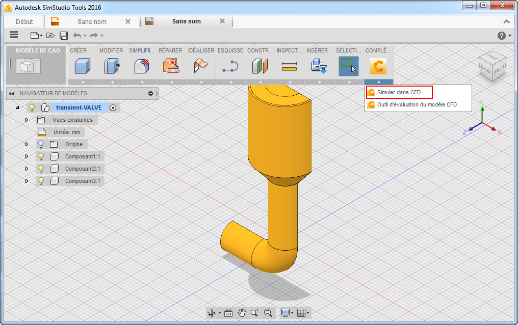 Développez le menu Compléments, puis sélectionnez Simuler dans CFD.