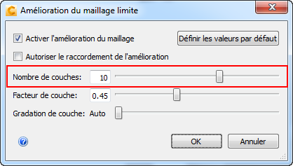 Dans la boîte de dialogue Amélioration du maillage limite, faites glisser le curseur Nombre de couches jusqu'à 10, puis cliquez sur OK.
