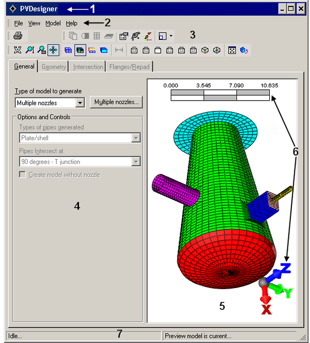 PVDesigner is a program in Autodesk Simulation that allows you to easily create intersecting cylinders or, more specifically, pressure vessels. This package will take the specifications (dimensions) you give it and will create a meshed model of either plate elements or bricks. Figure 1 shows the interface.