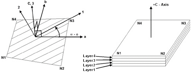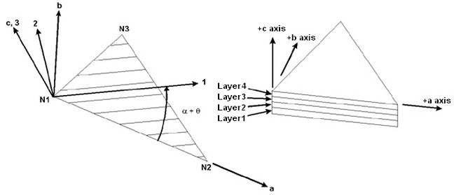 The layer 1-axis is the axis along the fiber of each individual layer. The layer 2-axis is the axis perpendicular to the fiber of each individual layer and is the plane of the element. The layer 3-axis is perpendicular to the element and therefore is parallel to the local element axis c.