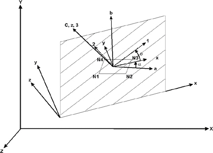 Triangular elements: The origin of the element axes a, b and c is defined at the first node, N1, of the element N1-N2-N3. The local a-axis is defined going from node N1 to node N2. The local c-axis is defined as the vector perpendicular to the plate element using the right-hand rule with respect to node numbering (N1 -> N2 -> N3). The local b-axis is defined as the vector perpendicular to the a-axis and c-axis obeying the right-hand rule. Refer to Figure 3.