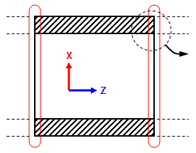 | Z symmetry conditions restrain the left face. Those nodes do not move in the Z direction. | MPC conditions restrain the right face to remain in a plane; the nodes move together in the Z direction. | Without MPC or other boundary conditions, the nodes on the right face are free to deflect due to the loads. This does not accurately simulate the portion of the vessel not included in the analysis. | ||