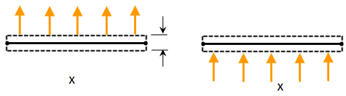(a) Planar element, one with a negative pressure applied to the top side of the element (left side of figure) and one with a positive pressure applied to the bottom side of the element (right side of figure). In the stress-free condition, the area of the top side and bottom sides are the same. (The element normal point is indicated by the X.)