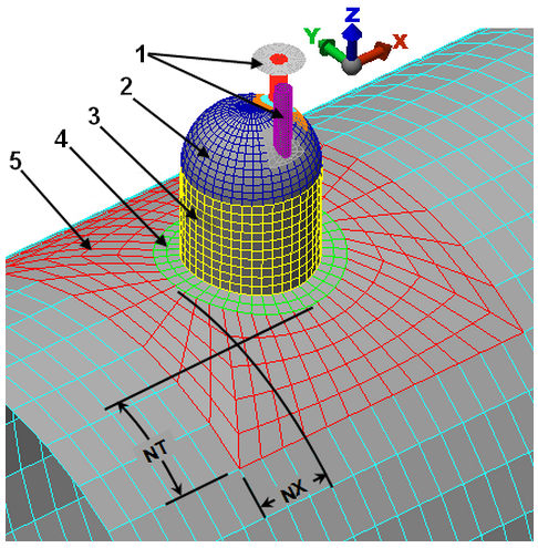 For the mesh around the nozzles, transition region, flange, repad, and heads on the nozzle, modify the nozzle of interest to display the Particular Nozzle dialog, then go to the Mesh tab. In addition to specifying the number of divisions, the size of the transition region around the nozzle to cylinder intersection is controlled by the Ratio of transition to cylinder diameter input. The dimension of the transition region, measured from the nozzle (or edge of the repad if included), is equal to or greater than the ratio input value times the cylinder diameter. The actual dimension of the transition region is adjusted to fit the mesh on the cylinder. See Figure 4.