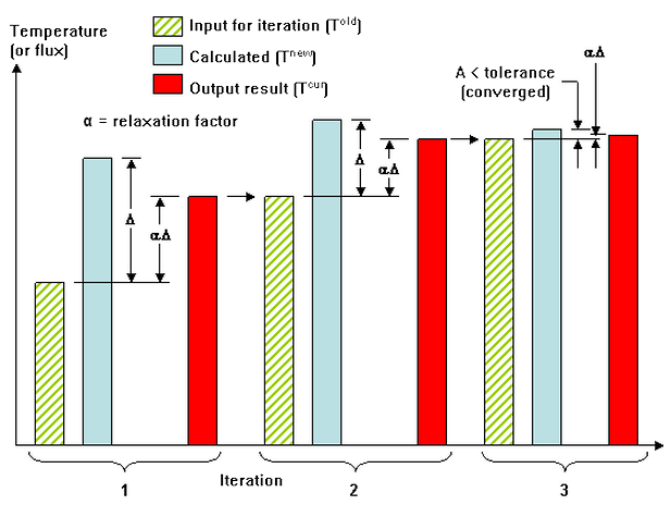 The temperature of a node after an iteration, Tnew, could be higher or lower than the final converged value. Thus, you may not want to use this value as the input for the next iteration. The value in the Relaxation parameter field can be used to minimize these oscillations. The relaxation parameter is used as follows: