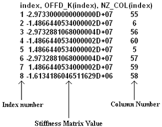 Both the first and second sections must be used to build the rest of the stiffness matrix. The fourth column of the first section defines how many non-zero values are in that row. Referring to Figure 5, the first row only has 1 non-zero off-diagonal value and the second row has 3 non-zero off-diagonal values. Therefore in Figure 6, the value for index 1 is located in the first row and the values in indices 2, 3 and 4 are in the second row. This method can be extended to determine the row for each term. Only the non-zero terms are listed in the second column. The value in the third column defines in which column of the matrix the term is located. Referring to Figure 6, the first value is located in column 55. Therefore the values in the first row of columns 2-54 are all 0. Likewise all the values in row 2 in columns 56-60 are 0. (The value in column 1 is on the diagonal and therefore is defined in the first section.) In the second row, there are 0s in columns 3-5, 7-55 and 57-59.The stiffness matrix is symmetric, therefore only the values to the upper right of the diagonal are defined. You can use symmetry to define the lower left half.