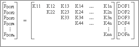 How do the terms in the stiffness matrix correlate to the model and the nodes? This can be understood from Figure 3. The DOF, which stands for degree of freedom, is related to a particular node and motion: either a translation or a rotation. This correlation can be determined by printing the equation numbers with the Global: Output: Equation numbers data option. Figure 4 shows a sample printout of the equations numbers, which appears in the summary file (.ML). In some cases, it may be easier to avoid the bandwidth minimization (Global: Options: Avoid bandwidth minimization).