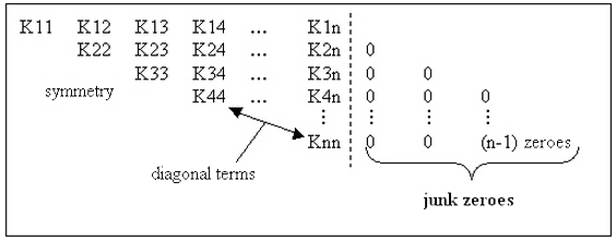 To understand the entries in the stiffness matrix, refer to Figure 2. The stiffness matrix is square and symmetric. The first number on each row of the matrix (keeping in mind that each row may require several lines of output) is the stiffness term on the diagonal. Terms after this are for the upper half of the stiffness matrix. However, each row in the output includes bandwidth number of terms. Thus, one zero (0) is added to each succeeding row of the output.