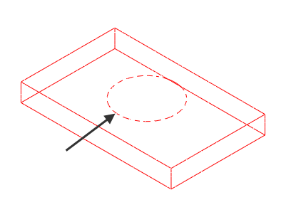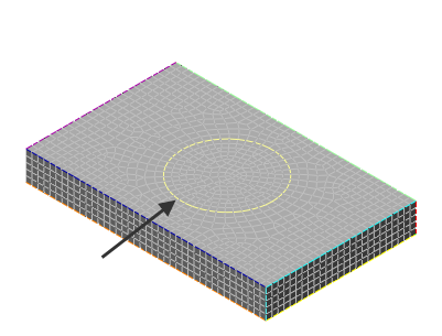 This is a wire frame view of one of the parts in a hypothetical analysis. Boundary conditions are desired along the circular edge within the top face of the rectangular part (to simulate the circular weld by which the rectangular part is mounted). Assume that the circular part is excluded from the CAD model and no circular feature is added to the rectangular part (such as by splitting the surface or adding a fictitious step or spotface). Without putting some kind of circular feature in the CAD solid model, the top of the rectangular part will be meshed with a pattern of rectangular elements. There will be no circle of nodes to constrain. |