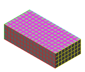 | Color by Surface – Top surface of large part is selected (magenta color). Note how the top is one big surface without using the surface splitting option. | Color by Surface – Top surface of large part is selected near the left end (magenta color). Note how the top is split into two portions when using the surface splitting option. |