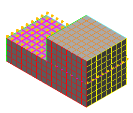 | A pressure load is applied to the selected surface on the larger part. It is easy to overlook that the load is applied underneath the smaller block in the model without surface splitting enabled (left image above). | |