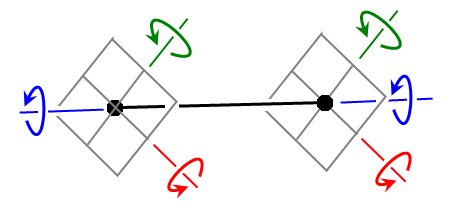 By default, the connections between the actuator element (black) and structure (gray) behave like ball joints; the structure at each end can rotate in all three directions independent of each other. If the Couple axial rotations of two ends of element option is activated, then a torque is transmitted through the actuator so that the axial rotation angle (blue arrows) of the structures attached to each end is identical. If the Couple planar rotations of two ends of element option is activated, then a moment is applied at each end of the actuator so that the perpendicular rotation angles (green and red arrows) of the structure attached to the actuator are identical.