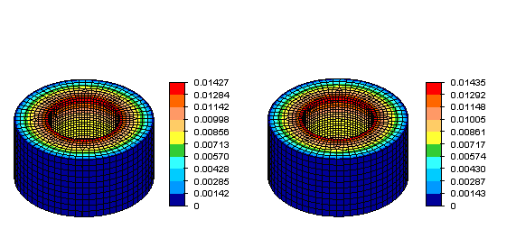 Figure 4: Displacement magnitude distributions obtained from a Mechanical Event Simulation (MES) analysis for a ring model with the outer surface fixed and a time-proportional pressure reaching a maximum of 100 lb/in2 seconds applied on the inner surface. The results are at the end of a 0.1 second event. The figure on the left is for the model without microholes, whereas that on the right is for the model with microholes. The latter predicts a maximum nodal displacement 0.56% greater than the former.