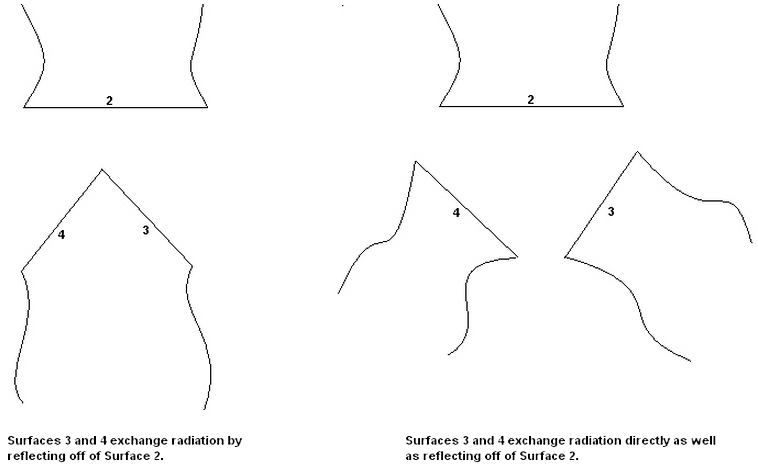 Once the radiation surfaces are defined, you must place them into enclosures. Due to reflection between surfaces, body-to-body radiation must be defined differently than other types of surface interactions that you may be familiar with. Take surface-to-surface contact for example. Surface 2 may contact Surface 3, and independently contact Surface 4. This does not mean that Surfaces 3 and 4 may contact. In body-to-body radiation, if Surface 2 can radiate to Surface 3 and Surface 4, then Surfaces 3 and 4 can exchange radiation either directly or indirectly as shown in Figure 1.
