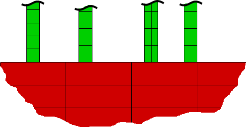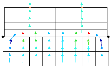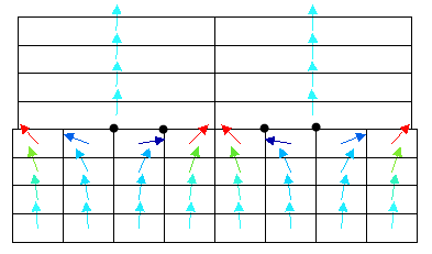 (b) Incorrect. When using Coarse bonded to fine mesh smart bonding, only the nodes on the coarse mesh are forced to follow the temperature of the fine mesh. Thus, the inner nodes on the finer mesh (shown by the dots) are not connected to the top part. These create a blockage to the flow of heat (shown by the arrows at the center of each element.) The heat must flow sideways at the blocked nodes to get to the top part; this creates a less accurate temperature profile. |