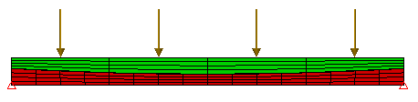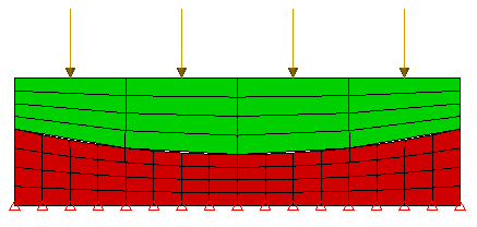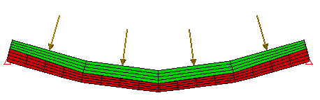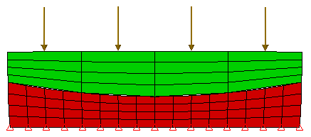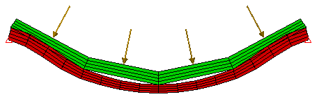 (b) Incorrect. When using Fine bonded to coarse mesh smart bonding, the nodes on the fine mesh are forced to follow the displacement of the coarse mesh. By forcing the fine mesh to bend to the same curvature produced by the coarser mesh, the displacement results are less accurate. Because of the kink or sudden change in slope in each set of 4 elements in the bottom part, the stress results in particular would show high stresses. The same exaggerated displacement scale used in (c) is shown here, so this deflection is noticeably smaller. |