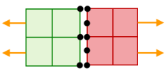 | Without smart bonding, the midside nodes in the part on the right can pull away from the face of the left part. (Only nodes on contact face shown for clarity.) | With smart bonding, the midside nodes are bonded to the face of the left part. Thus, the midside nodes cannot pull away. (Parts shown with slight gap for clarity.) |